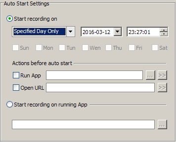 Start recording on specified day only, every day, every week and run app , open url at the same time. Or start recording on running some app .
