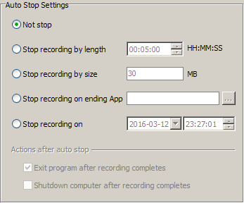 Stop recording by length. Stop recording by size. Stop recording on ending app. Stop recording on specified time and exit program after recording completes, shutdown computer after recording completes.