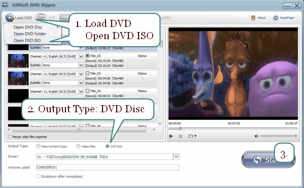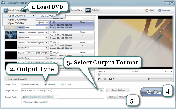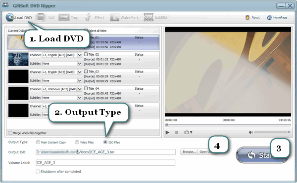 Insert DVD to DVD Drive, then Click Load DVD.There are three options available:(1) Open DVD disc from DVD drive; (2) Open DVD folder from hard disk VIDEO_TS directory;(3) Open DVD iso file from hard disk.
