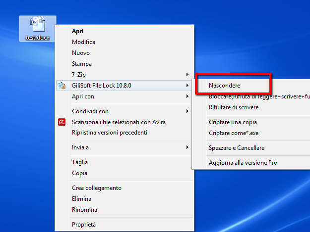 Un altro modo ancora più semplice per nascondere un file è quello di cliccarci sopra col tasto destro del mouse e selezionare "GiliSoft File Lock"-->"Nascondere", come mostrato qui sotto: