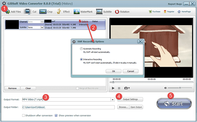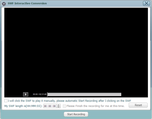 Set SWF Recording Option.If the SWF is a normal video that will start automatically, please choose 'Automatic Recording';If the SWF won't start automatically, you must click it to play manually, please choose 'Interactive Recording'.