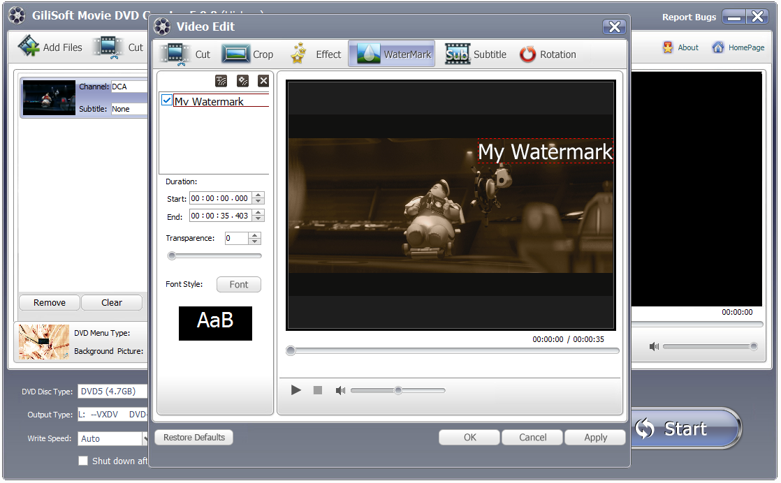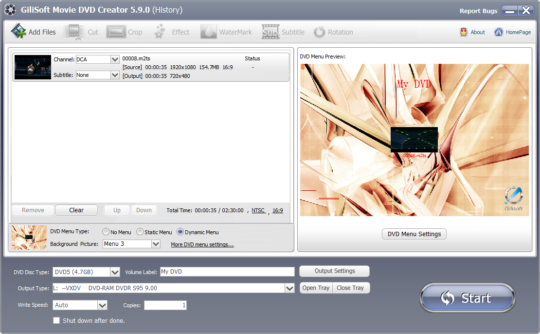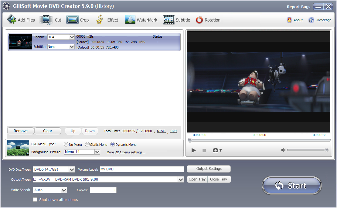No need to install extral video codec. Create DVD from almost all video formats, including AVI, XviD, DivX, MP4, MPG, MPEG, WMV, ASF, RM, RMVB, MOV, QT, M1V, M2V, M4V, DAT, VOB, MOD, DV, 3GP, 3G2, FLV, F4V, OGM, and H.264/AVC, MKV, M2TS, M2T, MTS, and TS.