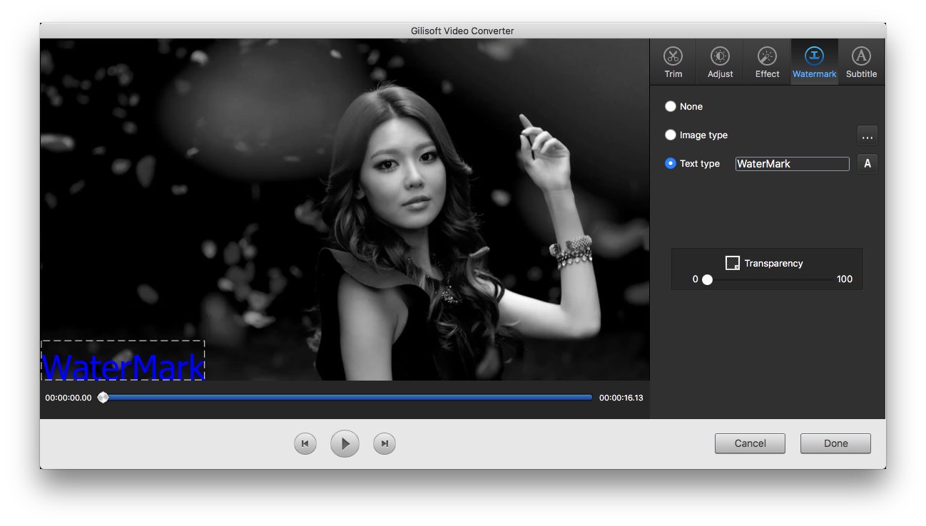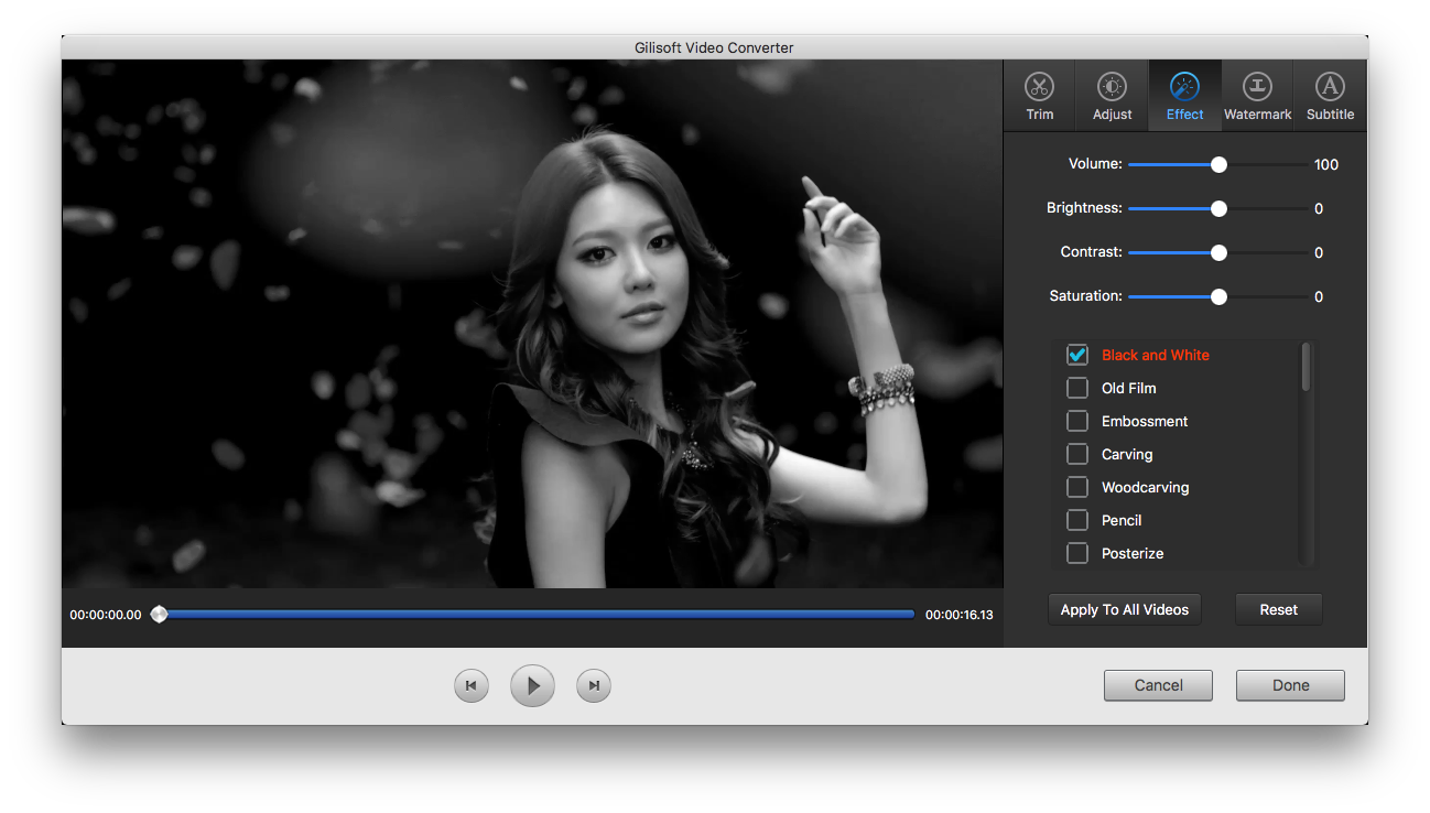 Adjust speed, brightness, saturation, and contrast, grayscale; Change aspect ratio, volume; Crop Video, rotate video; Picture In Picture; Add watermark to video; Add subtitle to video; Add special effects to video;